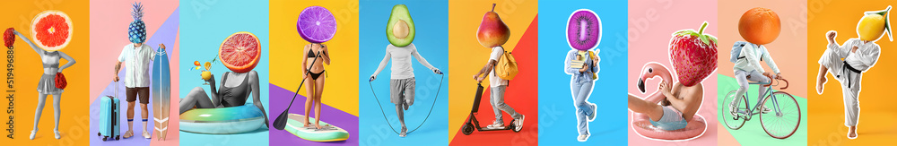 Set of people with different fruits instead of their heads on color background