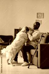 Blind African man in glasses playing with guide dog sitting on sofa at home