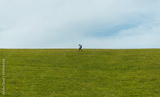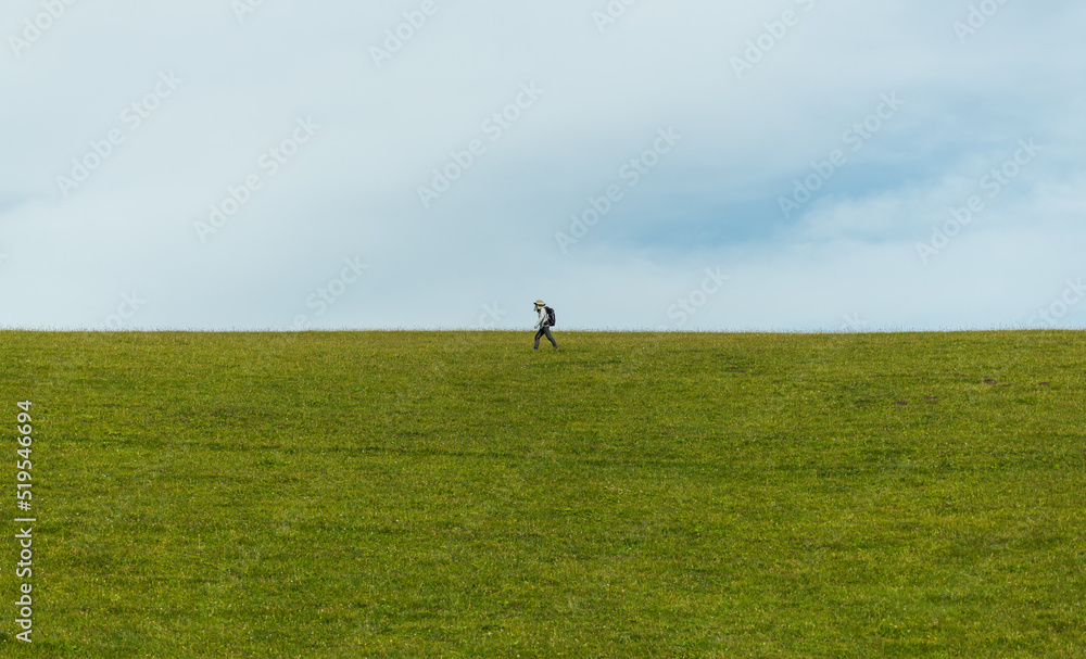 person walking on grassland under blue sky