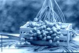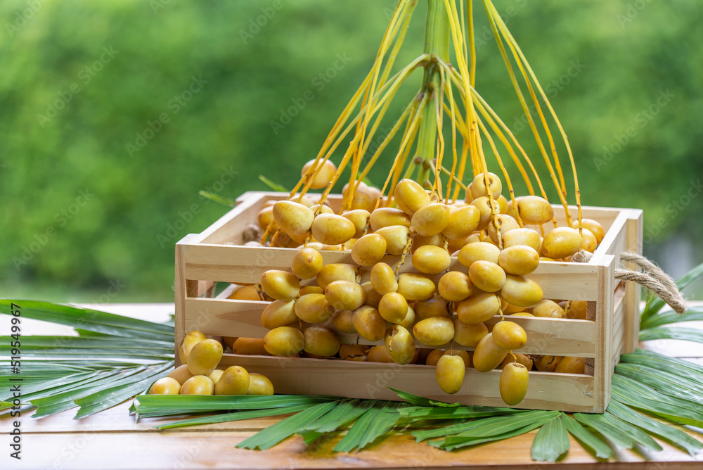 Yellow date palm in the basket with leaves on blur background, Fresh yellow date palm fruit over blurred greenery background.