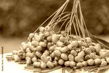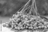 Yellow date palm in the basket with leaves on blur background, Fresh yellow date palm fruit over blurred greenery background.