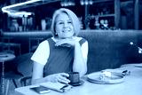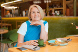 elegant elderly senior woman in a blue sundress holding a cup in her hands, sitting in a cozy cafe and relaxing enjoying