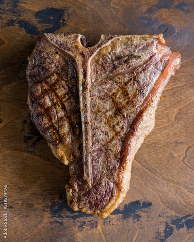 Steak T Bone, tibon steak, steak on bone on wooden table top view macro close up, vertical