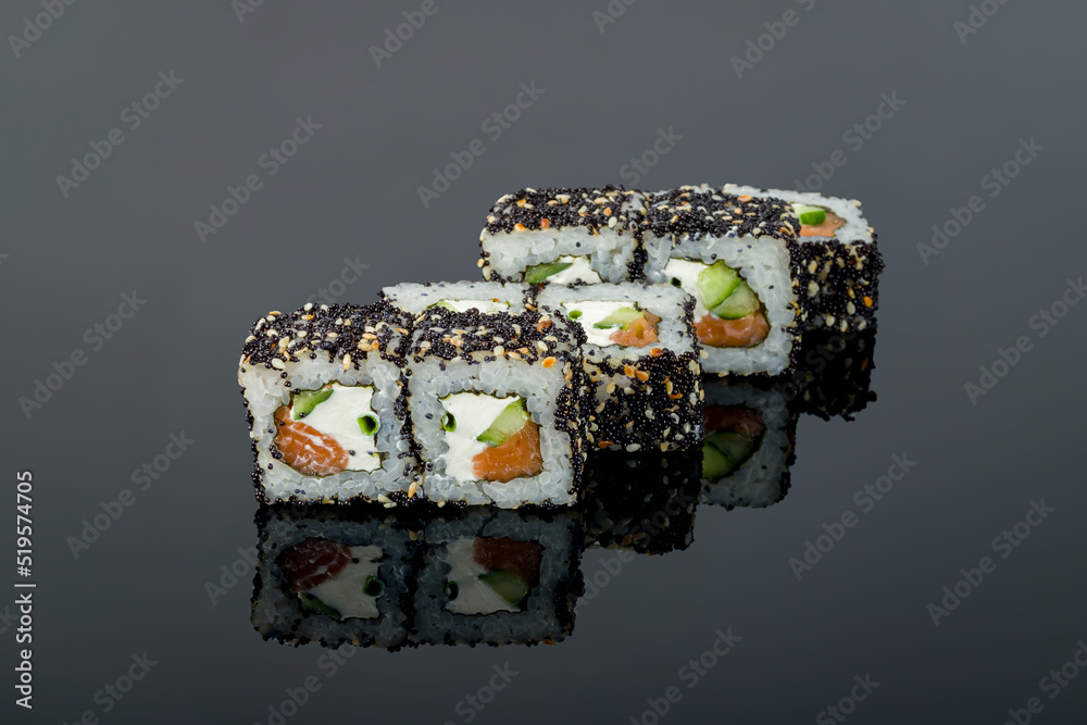 Philadelphia roll with salmon and cheese on black with reflection