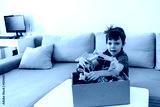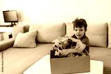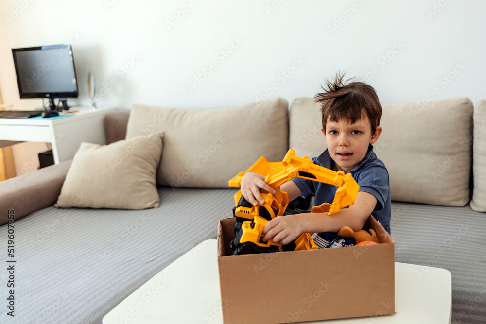 Adorable boy holding cardboard donation box full with folded clothes and toys.
