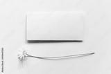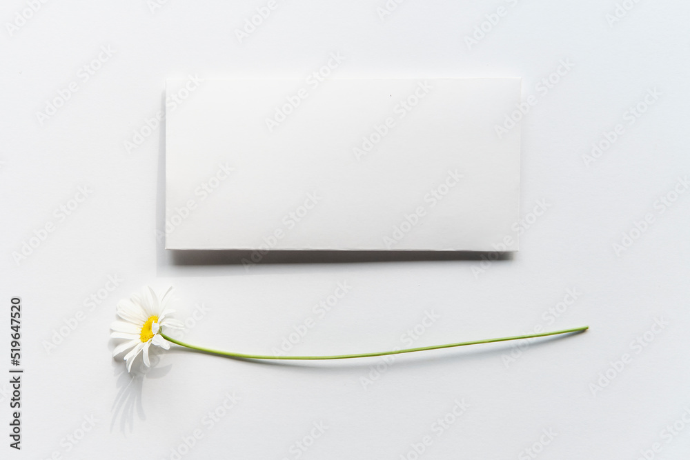 Summer still life. Greeting mockup scene on white background in sunlight. Blank paper, daisy flower.
