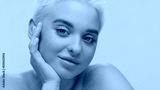 Close-up beauty portrait of good-looking young slim blonde Caucasian woman with naked shoulders resting her head on hand on pale pink background | Protected skin concept