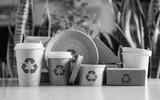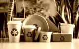 Paper eco-friendly disposable tableware with recycling signs on the background of green plants. The concept of using biodegradable materials.