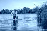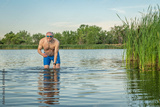 athletic, overweight senior male swimmer is splashing himself in a lake in Colorado