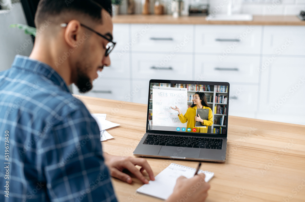 Distance online lesson. View over the shoulder of a guy, a student, on a laptop screen with a female teacher. The guy studies remotely, listens to a lecture, takes notes in a notebook, gains knowledge