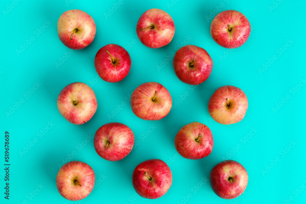 Fruit pattern of red apple over blue background. Flat lay, top view. Pop art design, creative summer concept. Food background. .