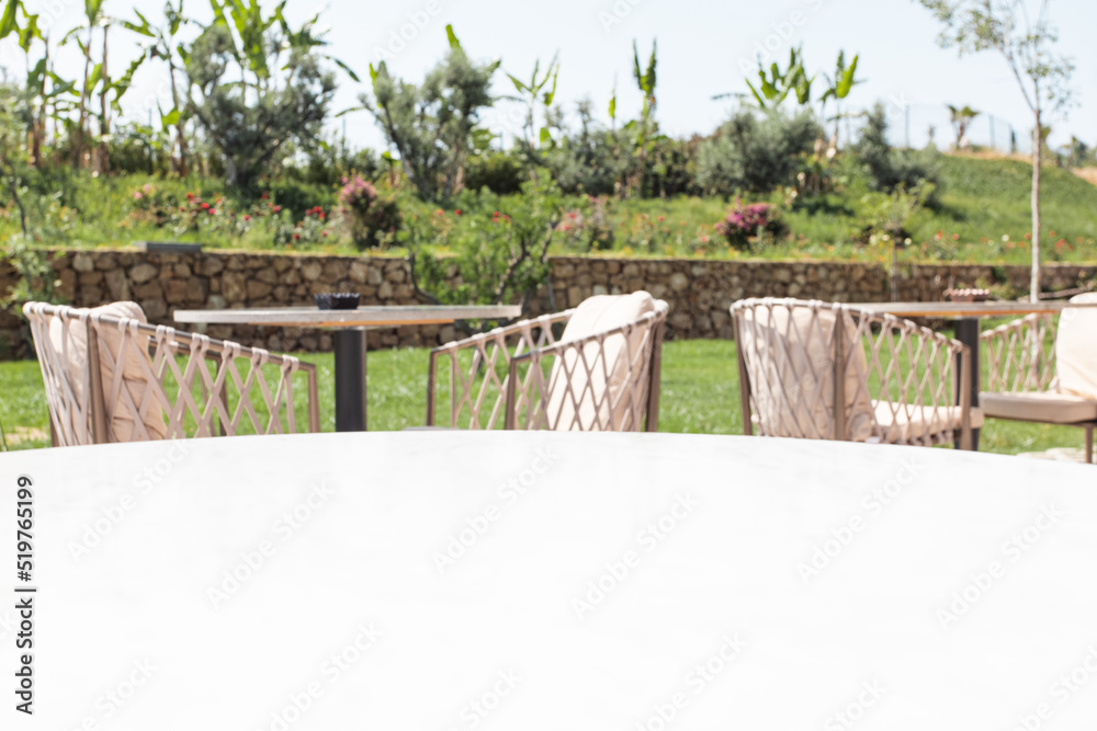 Table empty background in outdoor cafe , modern restaurant background.Front view. . Dining table. Brochure background.Bar outside in summer vacation