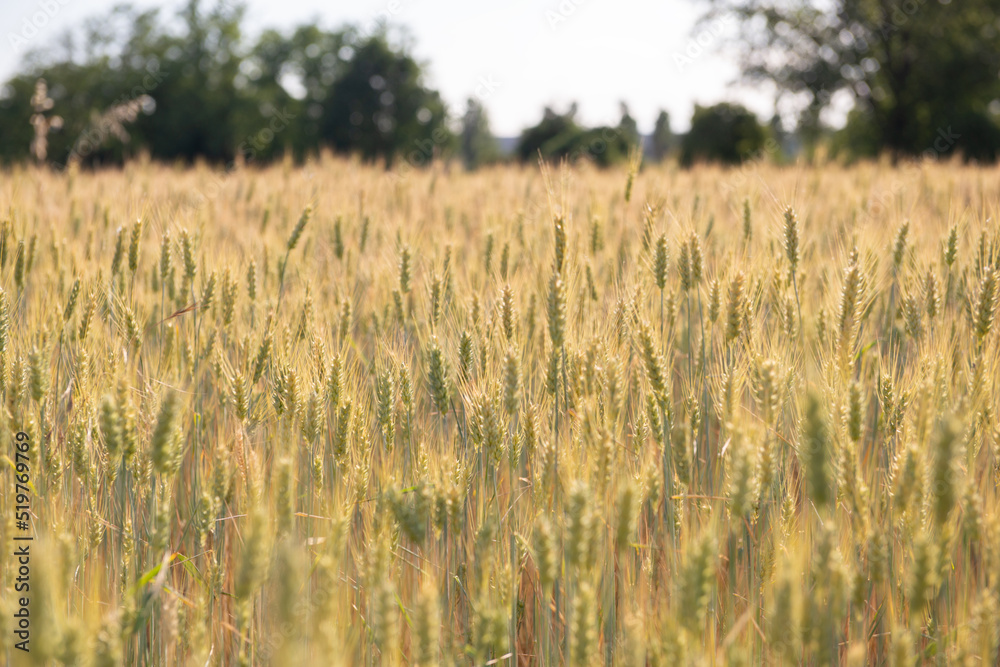 Field of cereals. Grain crops. Spikelets closeup, sunny June. Important food grains