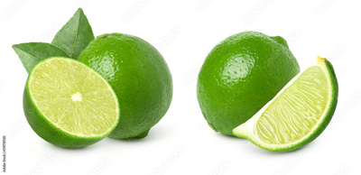 Natural fresh lime and lime slice with green leaf isolated on white background, cut out, collection