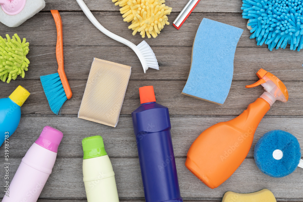 House cleaning plastic product on wood table background, home service or housekeeping concept
