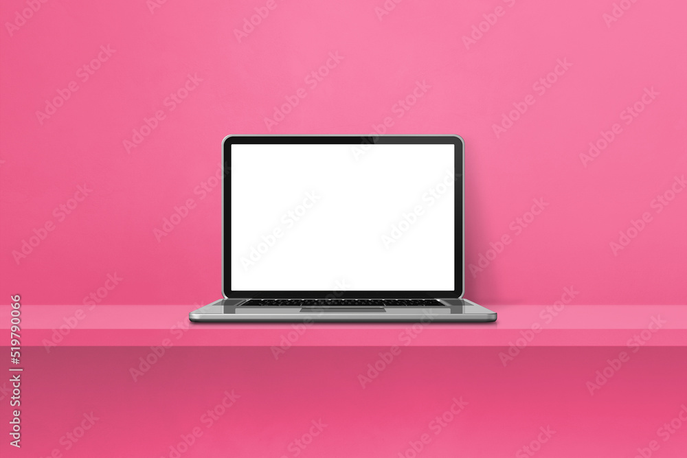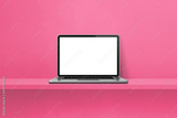 Laptop computer on pink shelf background
