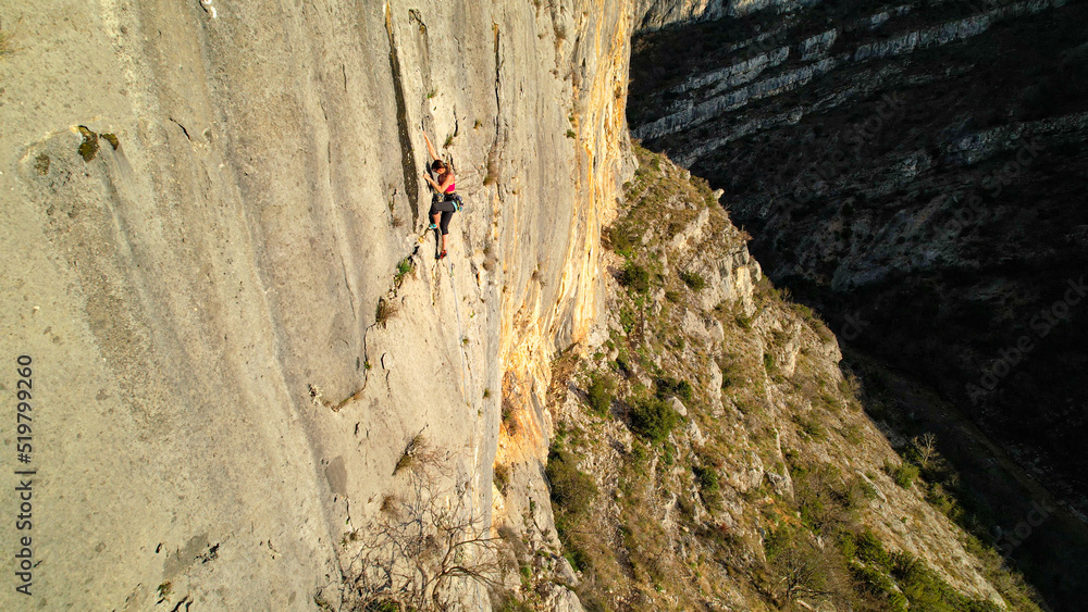 AERIAL: Young female climber lead climbing up the sunlit canyon limestone wall