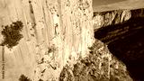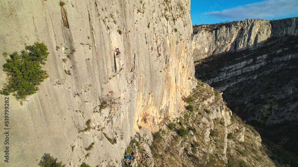 AERIAL: Gorgeous view of sunlit climbing canyon with young female rock climber