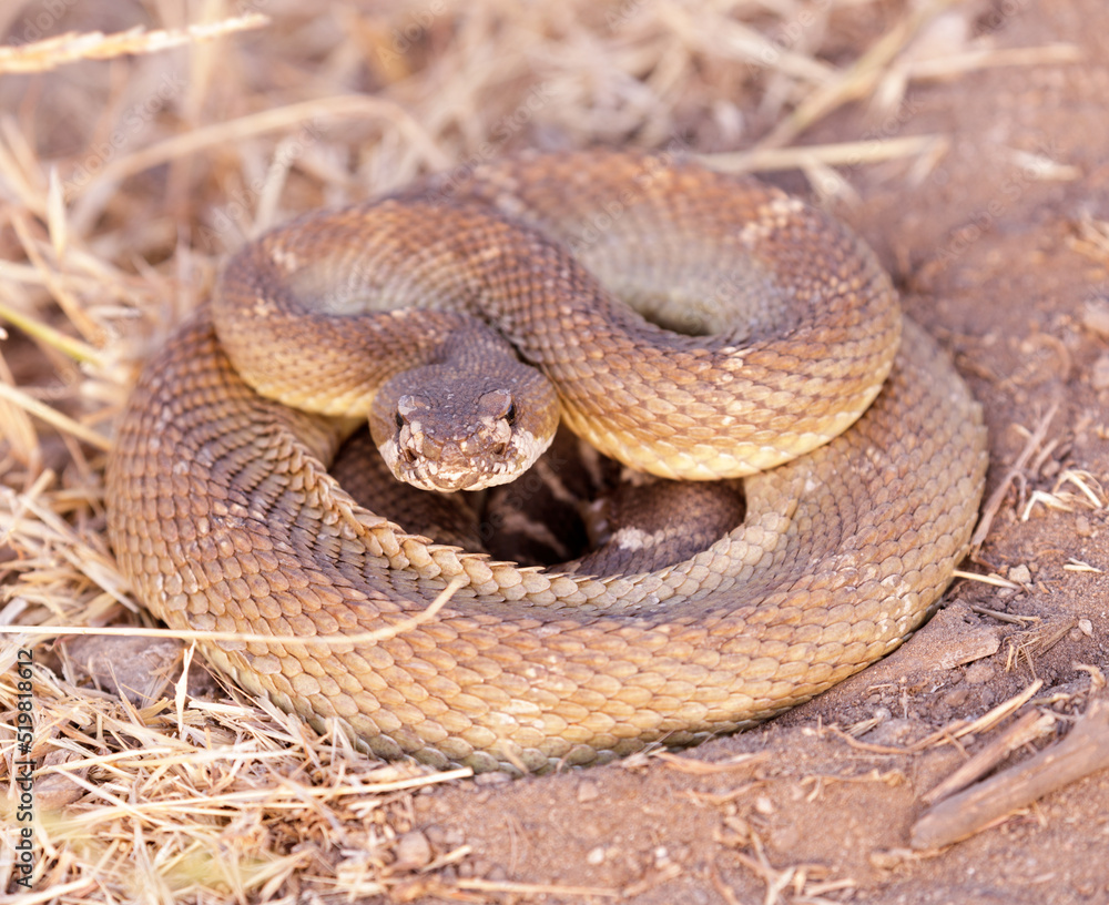 Amelanistic Juvenile Northern Pacific Rattlesnake in defensive posture. Mission Peak Regional Preserve, Alameda County, California, USA.