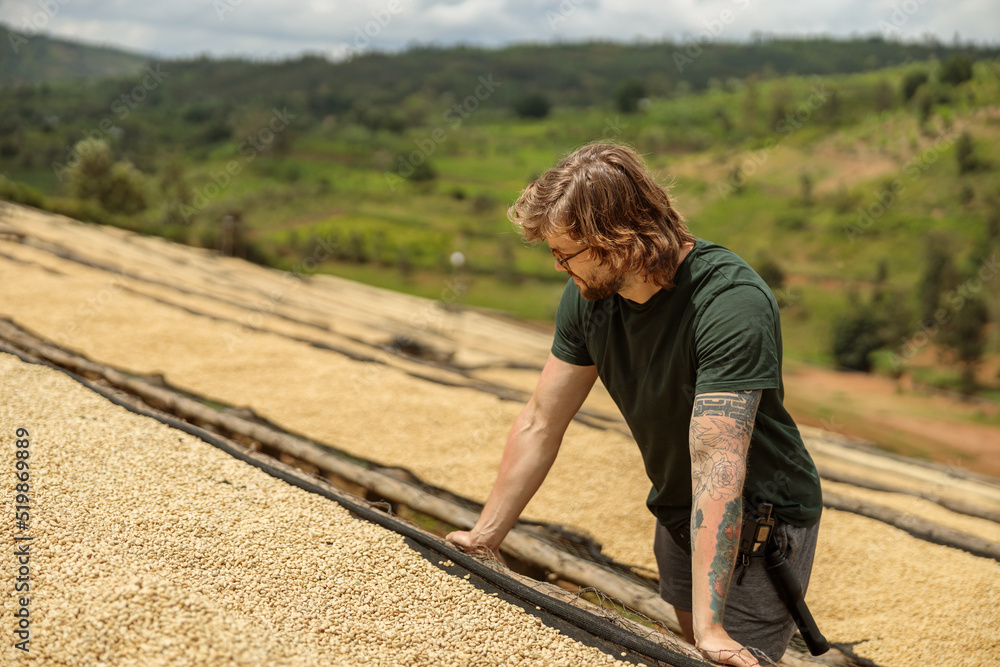 Male traveler examining coffee beans in the process of drying outdoors. Africa