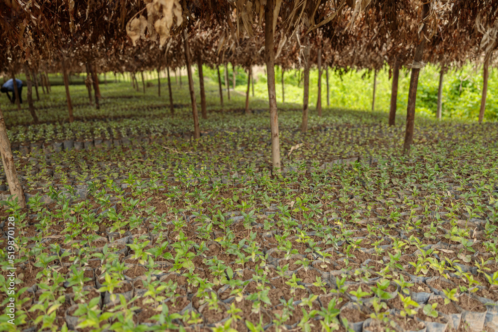 Many coffee sprouts among the trees on the plantation, Rwanda region