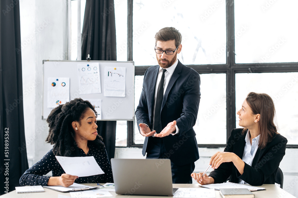 Teamwork concept. Caucasian male boss in a suit, holding a business meeting with his female multiracial colleagues, in a creative modern office, discussing a new business project, strategy