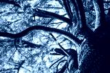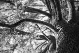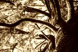 Under a shade of beautiful branching old tall green coniferous tree in a sunlight view from below. Winding tree branches in nature park, natural reserve, forest, garden, woods. Pine tree bark texture.