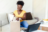 Cheerful African American woman with a beautiful smile, opening a gift at home, feeling happy. Beautiful young woman is holding cardboard box sitting on sofa at home.