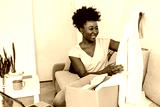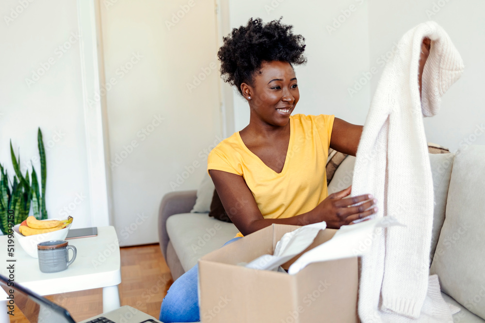 Cheerful African American woman with a beautiful smile, opening a gift at home, feeling happy. Beautiful young woman is holding cardboard box sitting on sofa at home.