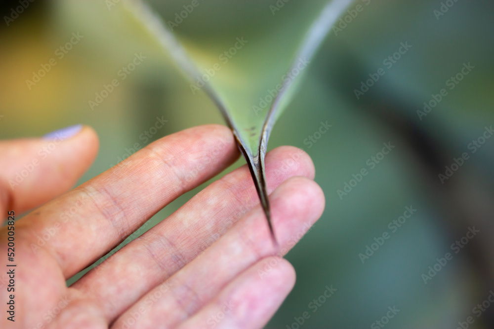A huge long black sharp prickly thorn of Agave fernandi regis in a woman's hand on green natural background. Succulent, cactus dangerous desert plants grows in Mexico. Agave plantation. Tequila leaves