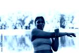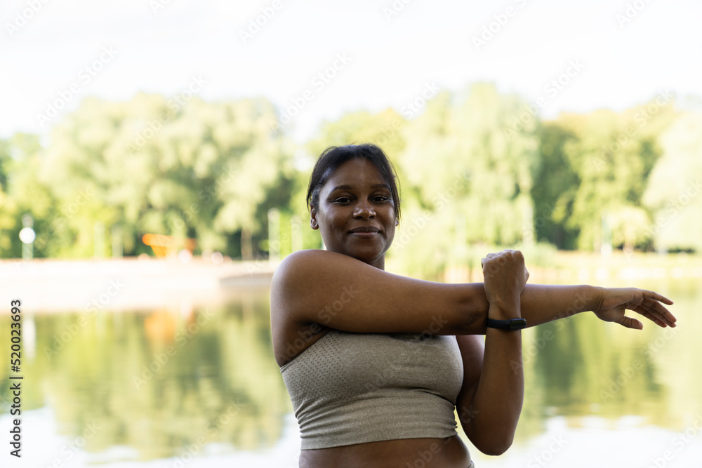 Plus sized African American woman stretching at the park in a summer day