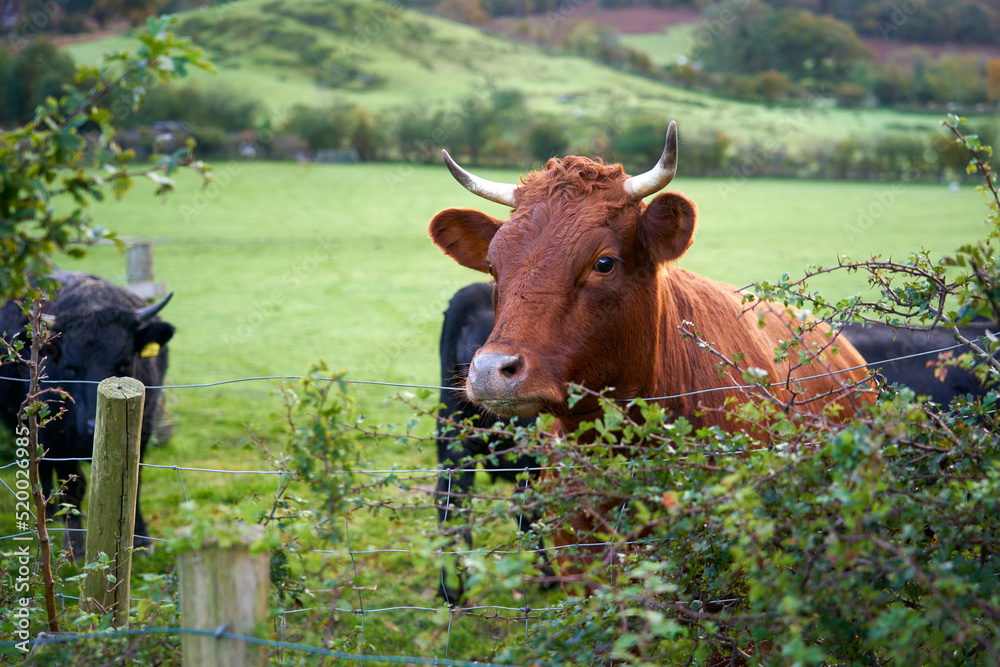 A brown cow looking over a hedgerow on a farm in the English countryside, UK.