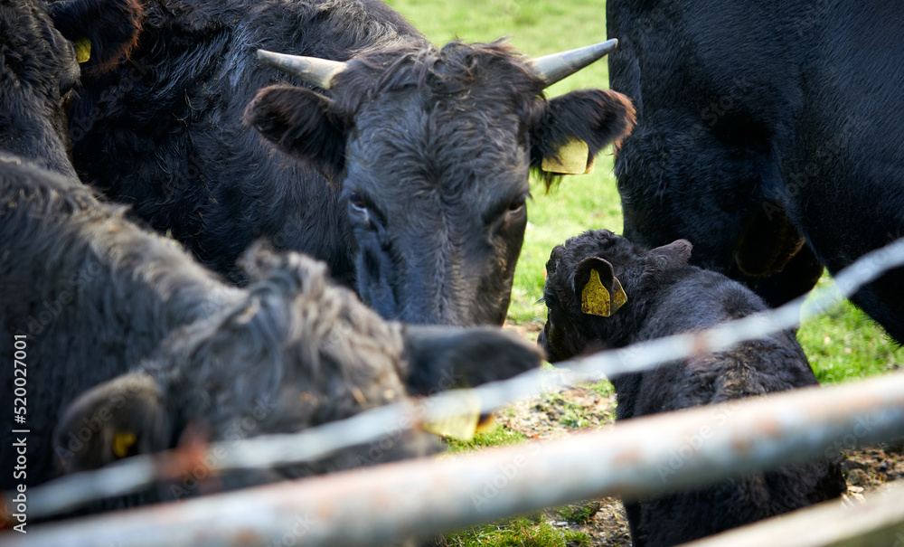 A young black calf beside it's mother on a cow, cattle farm in the English countryside.