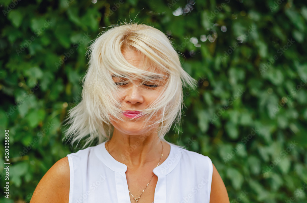 Portrait of a middle-aged woman against a background of green leaves. Success, antiaging