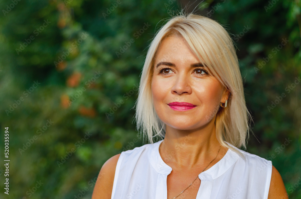 Portrait of a middle-aged woman against a background of green leaves. Success, antiaging