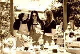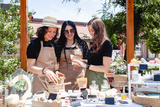 Three brunette women sellers of European appearance in aprons at a street fair laughing discuss their goods