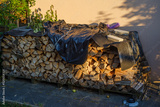 stockpile of wood in sunset light for the coming cold winter, autonomous heating because of the gas crisis in 2022.