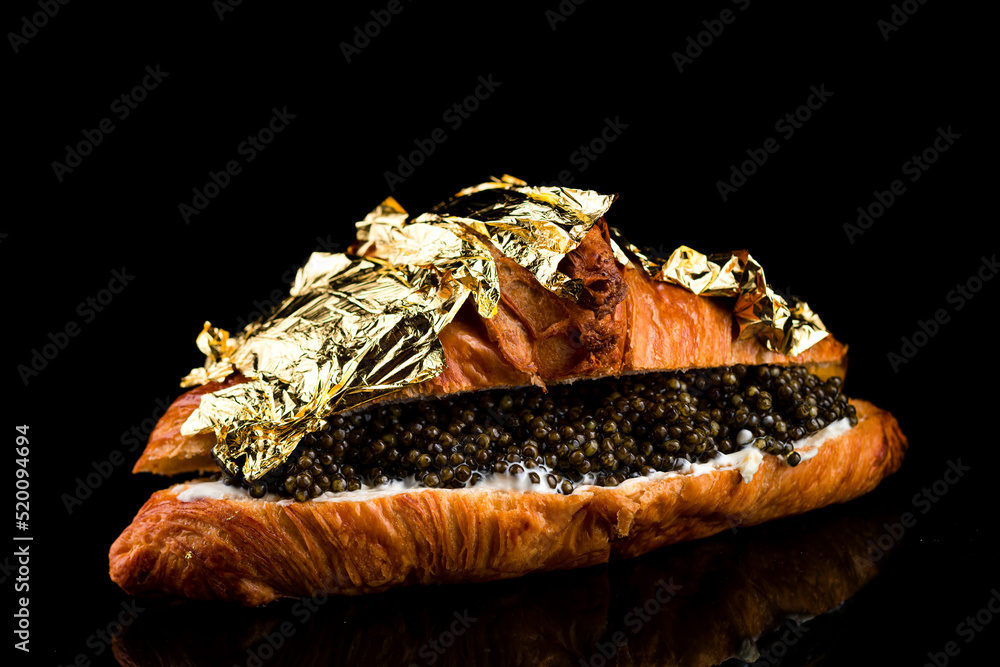 golden croissant with caviar, croissant for breakfast. Luxury breakfast.