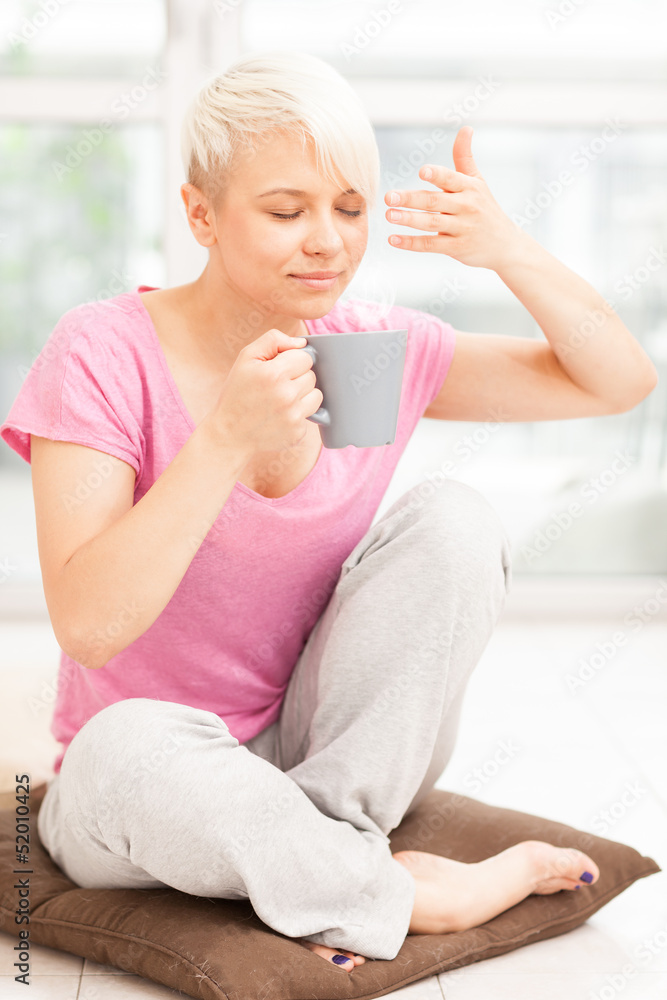 Smiling woman with mug sitting at home while smiling