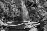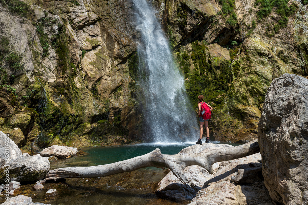 Female Hiker with Red Backpack under Beautiful Gregorcicev Waterfall in Slovene Julian Alps