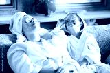 Fresh skincare, face mask and healthy skin treatment for bonding mother and daughter home spa day. Fun, smiling and playful child and parent relaxing with cucumber over their eyes in grooming routine