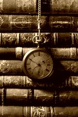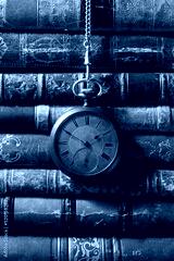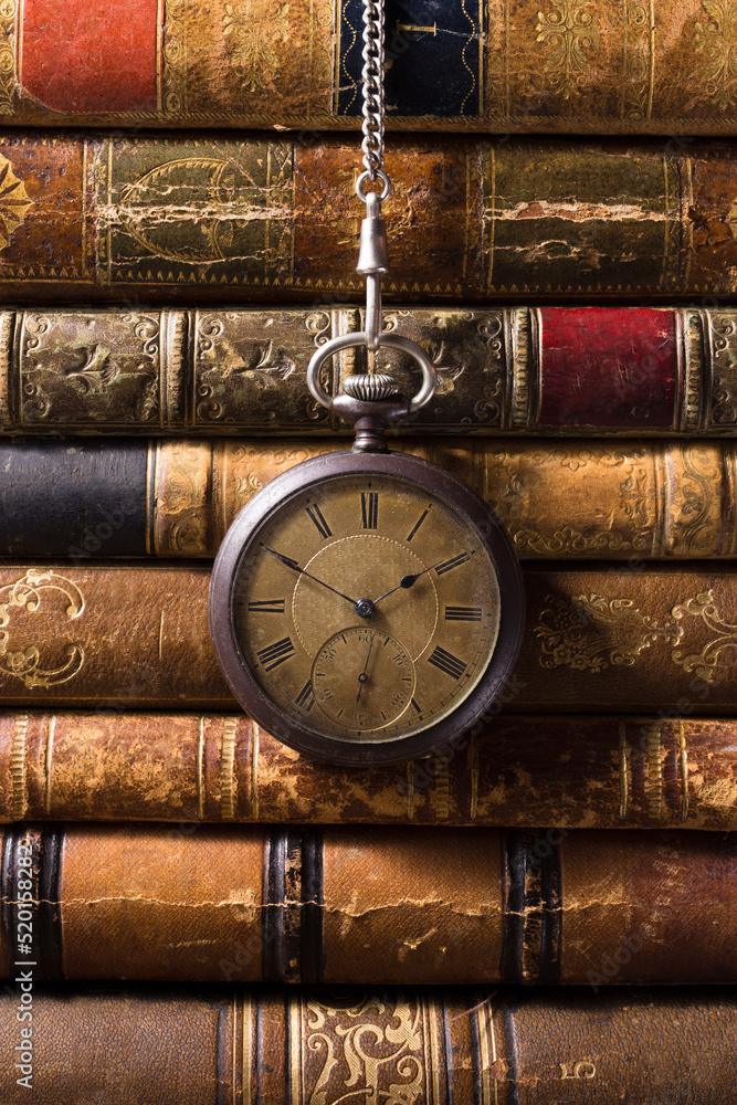 Vintage pocket watch with old books. Still life