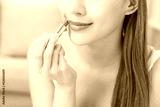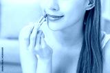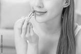 Beauty cosmetics concept, hand of asian young woman, girl make up face by applying lipstick, lips balm on her mouth, looking at the mirror at home. Female look with natural fashion style, skin care.