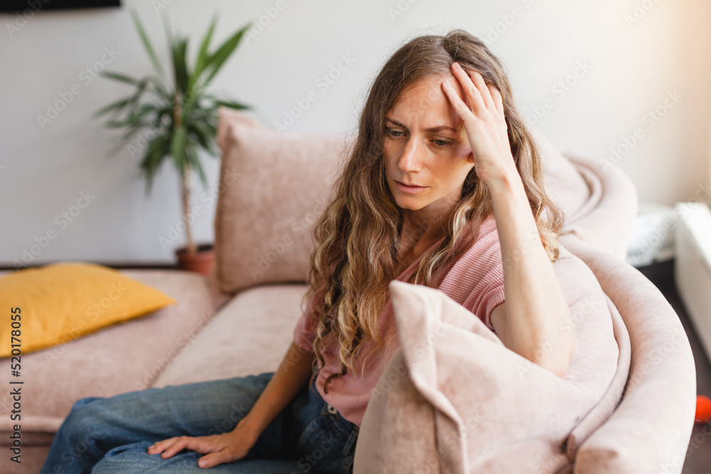 Sad woman thinking about problem, sitting alone on couch