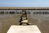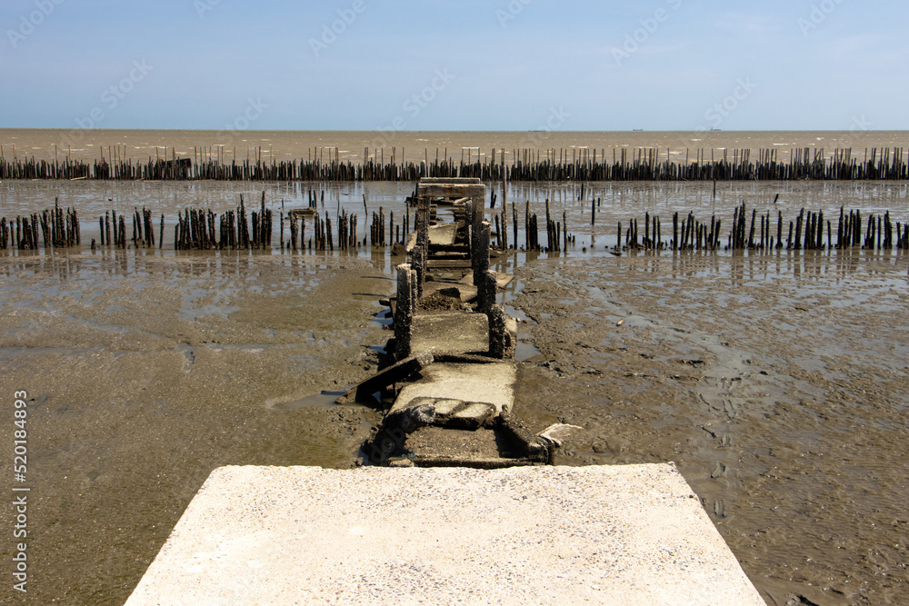 A demolished concrete trail on a pillars at the end of the way with horizon of the sea.