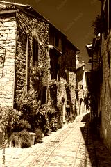 Beautiful medieval street with flowers and plants in the historic center of Spello, Umbria Italy