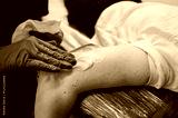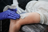 Hands with blue gloves of a tattoo artist spreading foamy soap on the skin of a client to wash and disinfect the newly completed tattoo at the studio. Tattooing process.