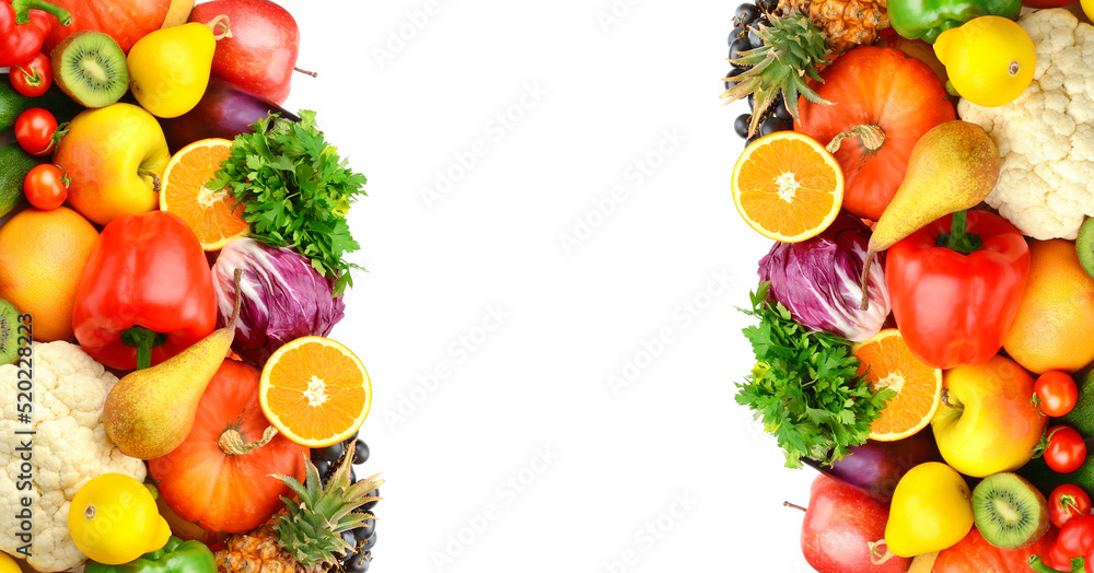 Different useful fruits and vegetables isolated on white background. Collage. Place for your text.