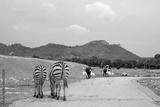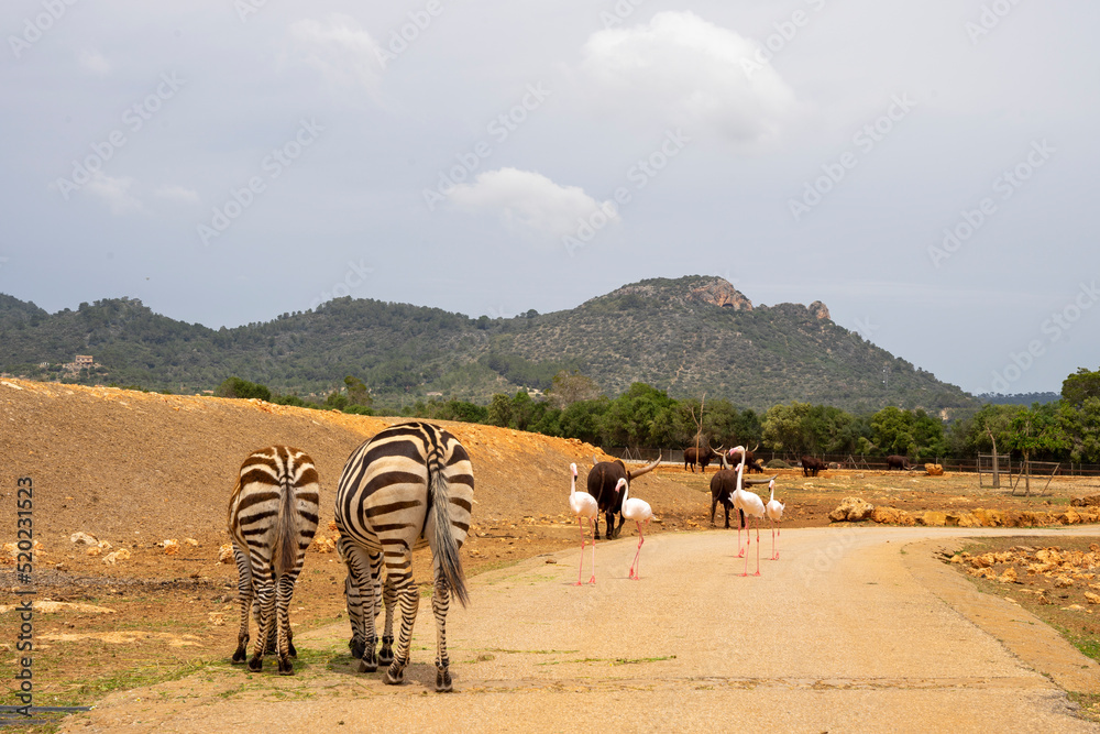Stado dzikich zwierząt na drodze, bawoły, flamingi oraz zebry.
