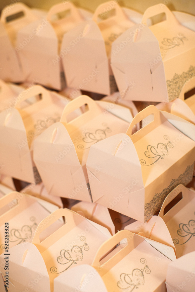 Rows of cardboard boxes with gifts at a wedding party